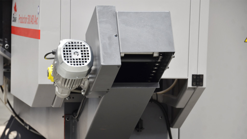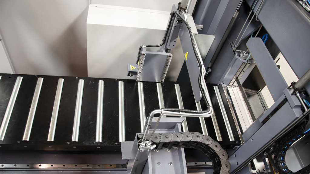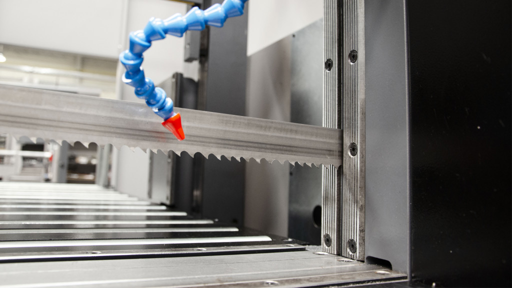 Az anyagot egy vezérelt szervóhajtás és egy golyósorsó juttatja a fűrészszalag alá.