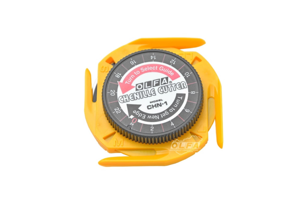 OLFA CHN-1 - Zsenília vágókés. Négy, különböző szélességű vezetővel rendelkező zsenília anyag készítő kés. A 60 mm-es körpenge éle teljes egészében kihasználható.