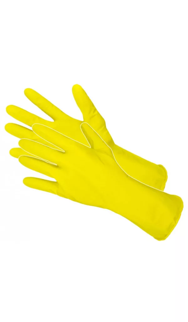 Hagyományos kialakítású háztartási latex kesztyű általános használatra. Természetes latex anyag.