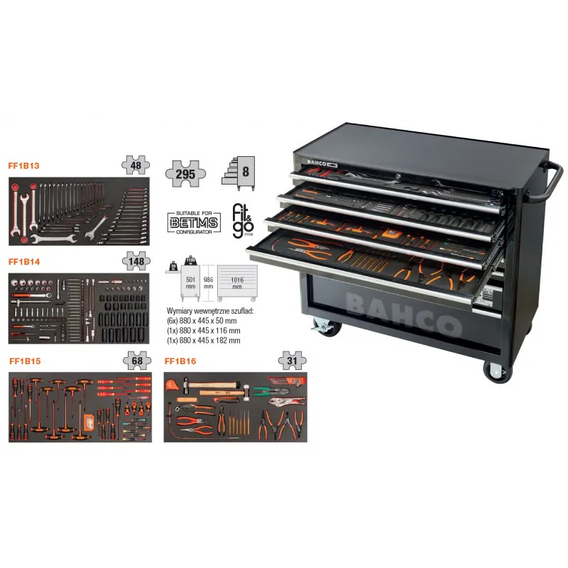 BAHCO 8 Fiókos Prémium szerszámkocsi FELTÖLTVE, 295 részes, 4 fiók feltöltéssel 1475KXL8 fekete 40"